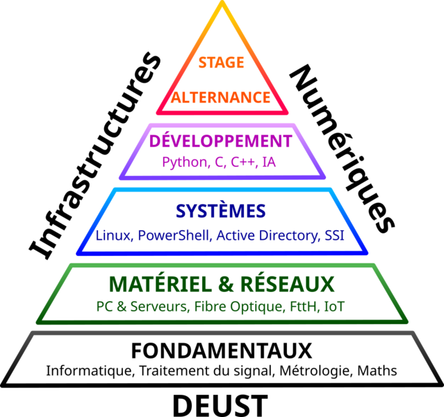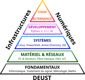 Depuis 2002, le DEUST Infrastructures Numériques de l’Université de Lille est une formation professionnalisante nationale au niveau bac+2 (2 ans/120 ECTS) visant l’insertion rapide de techniciens dans les métiers du numérique, en particulier pour installer et maintenir des réseaux (fibre optique, réseaux locaux) ou pour l’administration système. Sa force réside dans une formation transversale recouvrant des aspects théoriques (analyse de signaux, FttH, programmation) et pratiques (travaux pratiques, mises en situation), couplée avec une période importante en entreprise. Au sortir du DEUST, les étudiants sont prêts à s’insérer dans le monde professionnel dans les corps de métiers suivants :